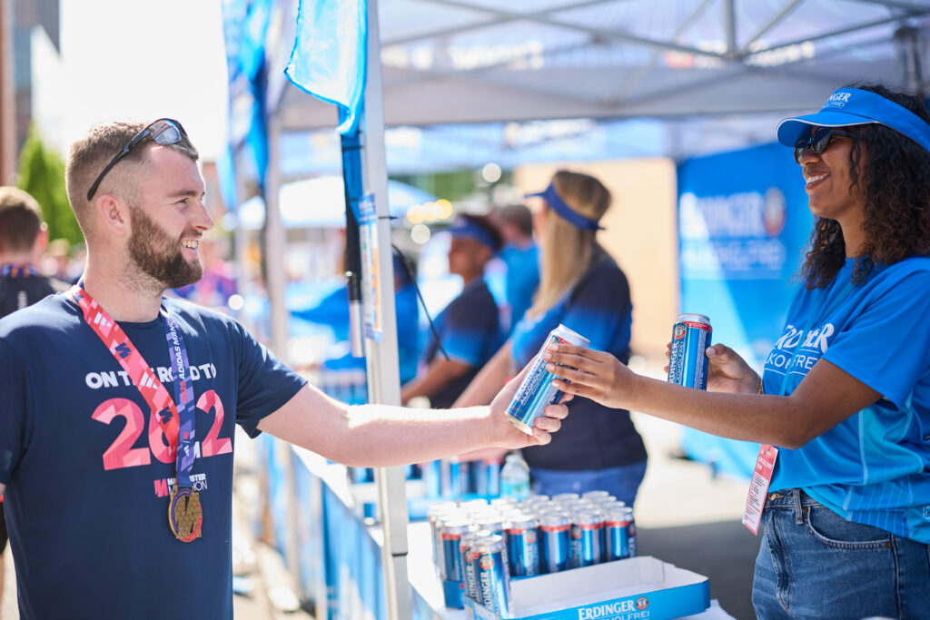 Time to recover, rehydrated and celebrate with an isotonic ERDINGER Alkoholfrei! The refreshing post-marathon drink will supply your body with what it needs, while celebrating in style alongside the ERDINGER Alkoholfrei DJ!
