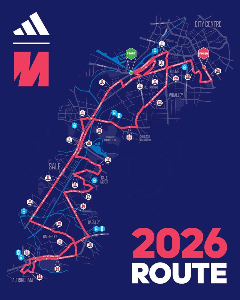We are delighted to share the official route for the 2026 adidas Manchester Marathon. Streaming through the vibrant streets of Greater Manchester, the 26.2 mile course will welcome 40,000 challengers on 19th April. With landmarks such as Old Trafford and the iconic Oxford Road finish line outside the University of Manchester, the electric energy the event is known for will be in no short supply.