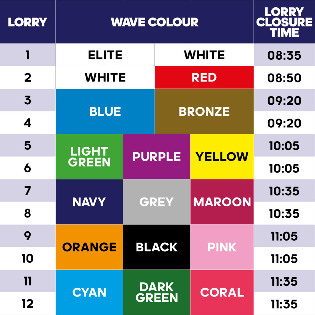 - Bag Collection: Volunteers will provide you with a see-through waterproof bag. Place your backpack or rucksack entirely inside and ensure iti’s securely tied. There will be security checks in place.