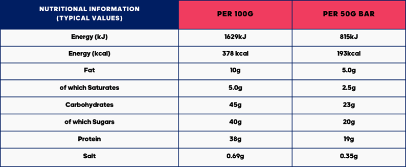 Milk Protein, Glucose Syrup, Milk Chocolate 20% (Sugar, Cocoa Butter, Whole Milk Powder, Cocoa Mass, Emulsifier (Soy Lecithin), Natural Flavourings), Invert Sugar Syrup, Soy Protein, Low Fat Cocoa, Sugar, Soy Oil, Cocoa Butter, Natural Flavourings, Whole Milk Powder, Cocoa Mass, Salt, Emulsifier (Soy Lecithin)