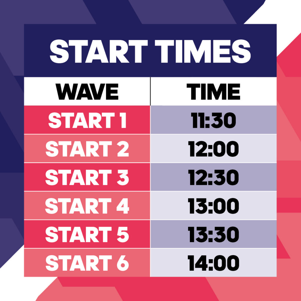 There are multiple start times available, shown in the table below, and participants can choose the time that suits them best. There’s no need to confirm your choice in advance, just arrive at the start area at least 10 minutes before your selected time. Groups of four can choose to start together or allow each member to run at the time that works best for them.