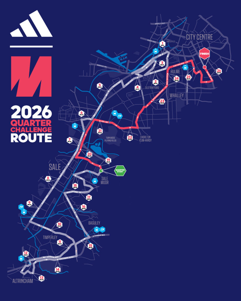 The adidas Manchester Marathon Quarter Challenge is your chance to be part of the electric atmosphere of marathon day in Manchester, without taking on the full 26.2 miles. Tackle the final 10.55km of the official marathon route as an individual or as a team of four, finishing on Oxford Road at the same finish line as the full marathon. All participants will receive a finisher medal and finisher T-shirt.