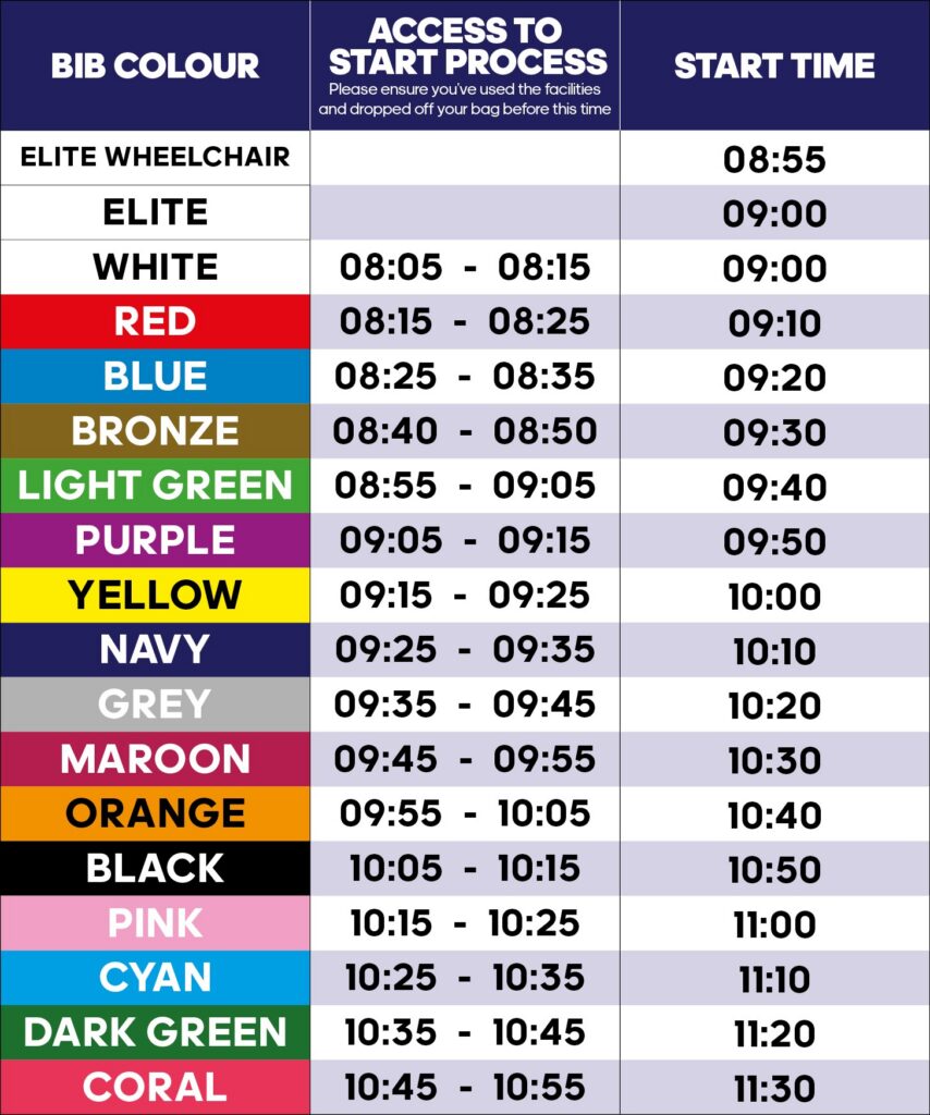 The colour of the bib you receive in either the post or at Pack Collection will relate to your allocated start time. Start times are assigned based on the predicted time you provided during registration and correspond to the colour on your numbered bib.