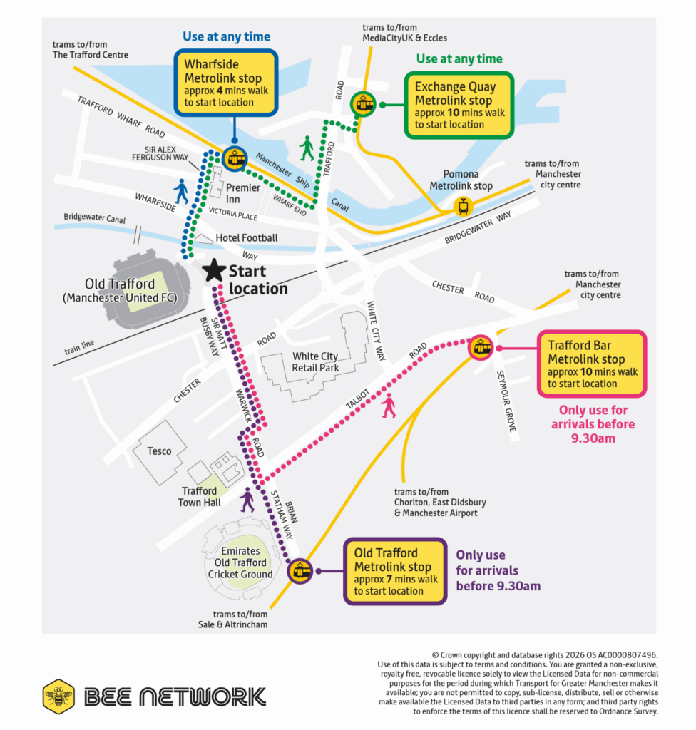 Although no tram stops will close for the event, participants are advised to avoid Old Trafford and Trafford Bar if arriving after 9:30am. The start area is less accessible from these stations and crossing the busy route at designated points may cause delays.